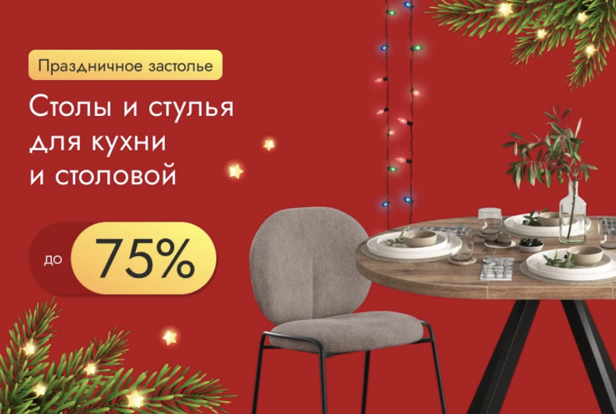 Праздничный стол с фирменными блюдами, оливье и мандаринами, за которым собралась вся семья — традиционный атрибут Нового года. Выбирайте столы и стулья из сотен товаров со скидкой до 75%, и встречайте главный праздник зимы так, чтобы зарядиться яркими эмоциями до прихода весны!